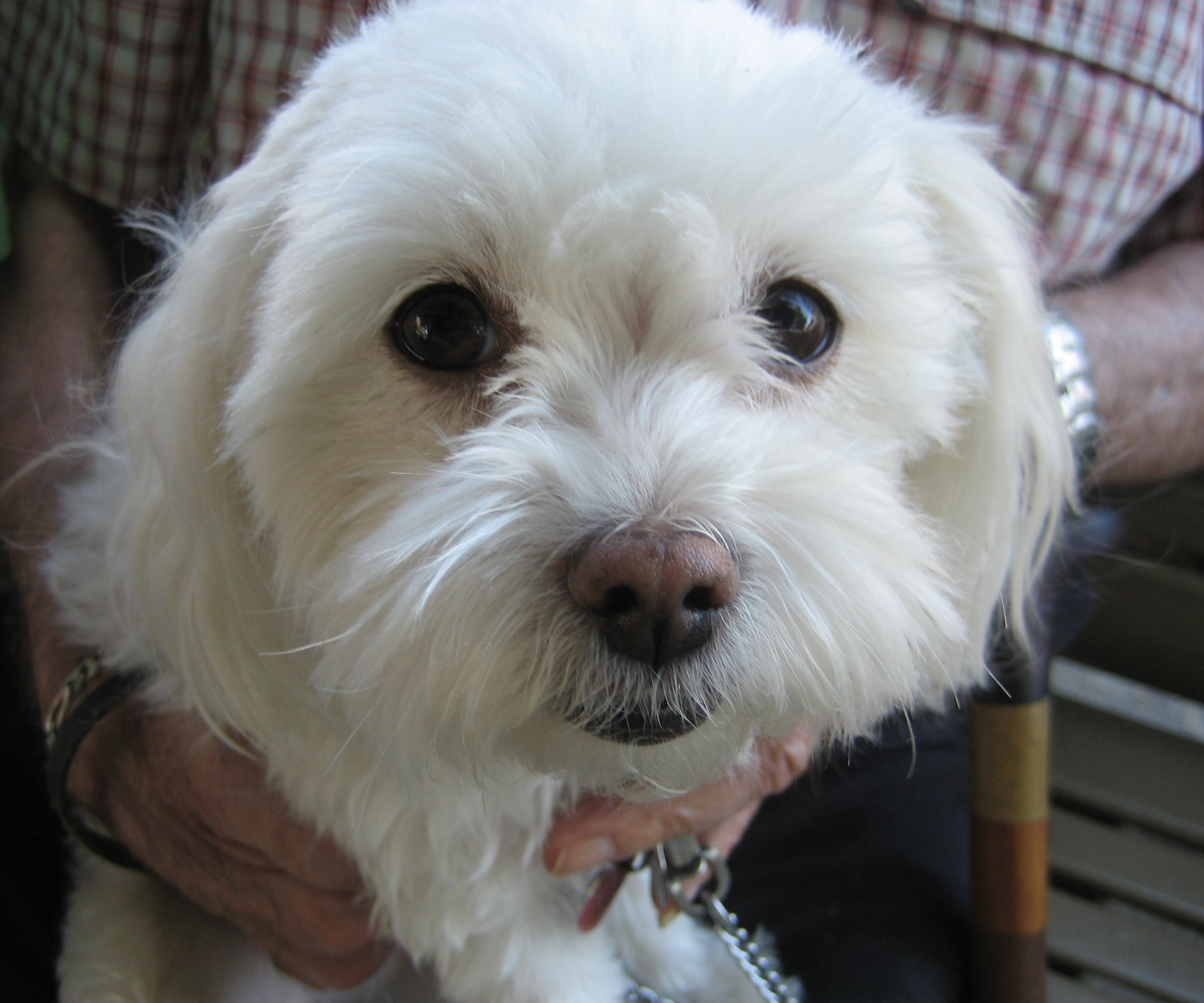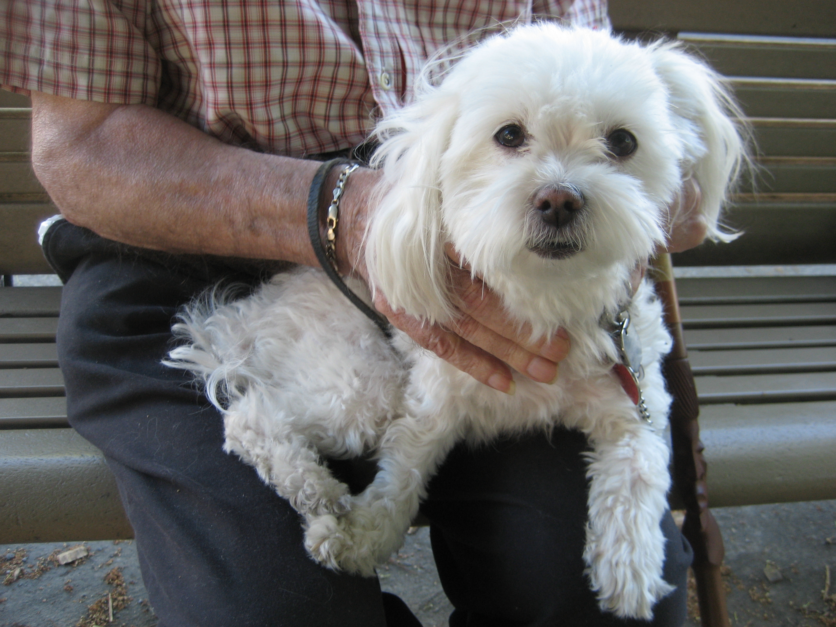 I meet a dog on the leafy streets of my hound-mad neighborhood, lounging on a bench in the shade. Small, fluffy and impossibly white, a Zen portrait of a clean conscience and absolute faith. My heart gongs when I see her.